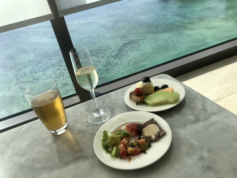 3시에 체크인을 하고 숙소에 짐을 풀고 나니 괌 두짓타니 클럽라운지 티타임 시간이 얼마 남지 않았어요. 클럽룸을 예약했으니 웬만하면 라운지는 꼬박꼬박 이용해 보기로 했어요. 티타임 시간에 갔더니 그때가 햇빛이 바로 비칠 때라 그런지 블라인드가 다 쳐져있었어요. 뷰가 보고 싶어서 걷을까 하다가 너무 뜨겁고 눈이 부셔서 참았어요. 햇빛이 강해서 에어컨을 켰는데도 더운 느낌이 들었네요. 블라인드가 쳐져서 뷰가 가리는 것이 아쉬웠는데 다행히 다음날 아침 제대로 된 뷰를 볼 수 있었어요. 정말 눈으로 보고 있어도 믿기지가 않은 뷰였어요. 다음날 두 번째 티타임 시간대에 왔을 때에는 더워서 창가석에 안 앉았어요. 이미 충분히 봤으므로