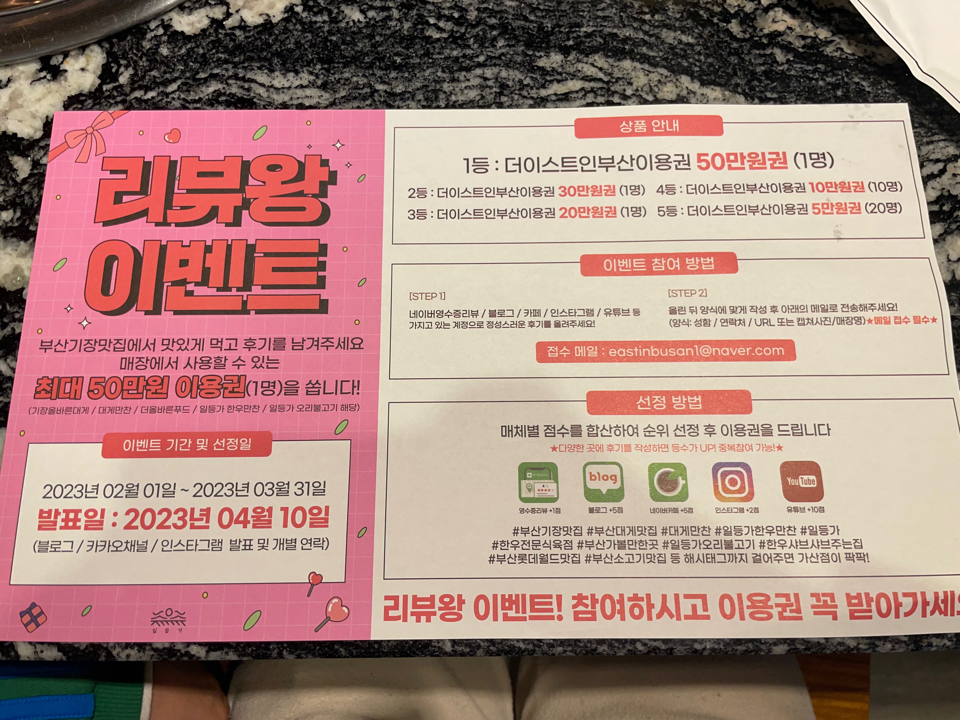 한우만찬! 한우는 원래 여기서 먹는 겁니다! 네 그래서 저희도 먹으러 왔습니다. 리뷰왕 이벤트를 진행하고 있었습니다. 부산 기장맛집에서 맛있게 먹고 후기를 남기면 매장에서 사용할 수 있는 상품권을 주신다고 해요. 발표일이 4월 10일이네요. 사실 블로그를 하고 있긴 하지만 이벤트에 참여하기 위해서 거짓말로 쓰지는 않아요. 저는 제가 느낀 것을 솔직하게 적는 것을 좋아하기 때문에 리뷰왕 이벤트와는 상관없이 솔직하게 적어 보겠습니다.
