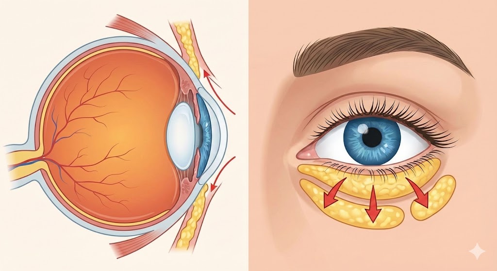 나이가 들거나 피부 탄력이 떨어지면 눈 안쪽 지방을 지지하는 조직(안와격막)이 약해지면서 지방이 앞으로 밀려 나오게 됩니다. 이로 인해 눈 밑이 불룩해지고 그림자가 생기면서 피곤하거나 나이 들어 보이는 인상을 주게 됩니다.