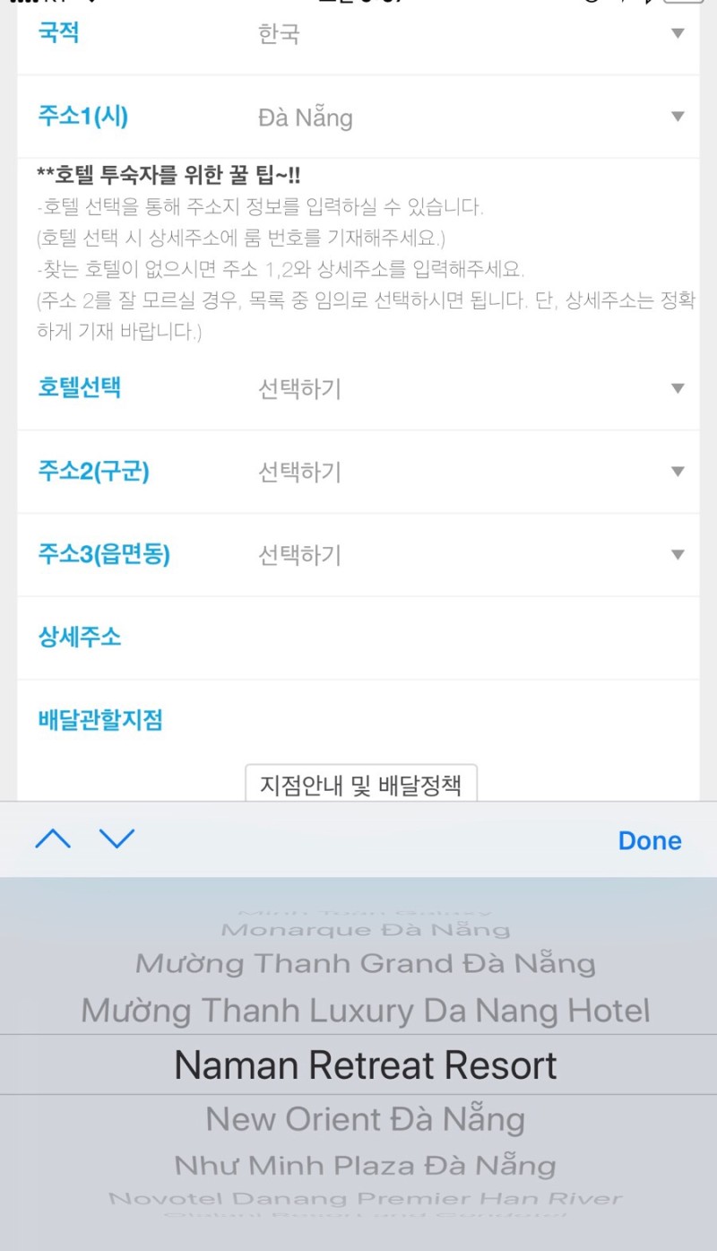 - 현지에서 물건을 배달받을 곳, 숙소를 입력할 수 있는 공간이 있어요. 직접 주소를 입력해도 되지만 호텔선택 메뉴를 보면 웬만한 호텔은 다 나와있어요.