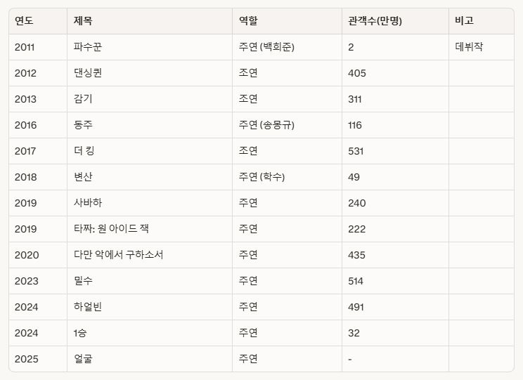 박정민의 영화 경력은 2011년 '파수꾼' 데뷔 후 주연작이 늘며 대성공을 거뒀습니다. 아래 테이블은 주요 작품을 연도순으로 정리한 것입니다.