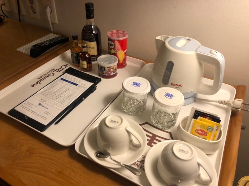 코모도호텔 객실 엔틱? 빈티지스럽고요. 어째 보면 좀 낡은 느낌은 나지요. 커피포트랑 잔, 차 티백들이 있었고 냉장고 안에는 생수 두병이 프리드링크로 들어있어요. 나머지 에비앙 같은 생수는 돈을 내야 해요.