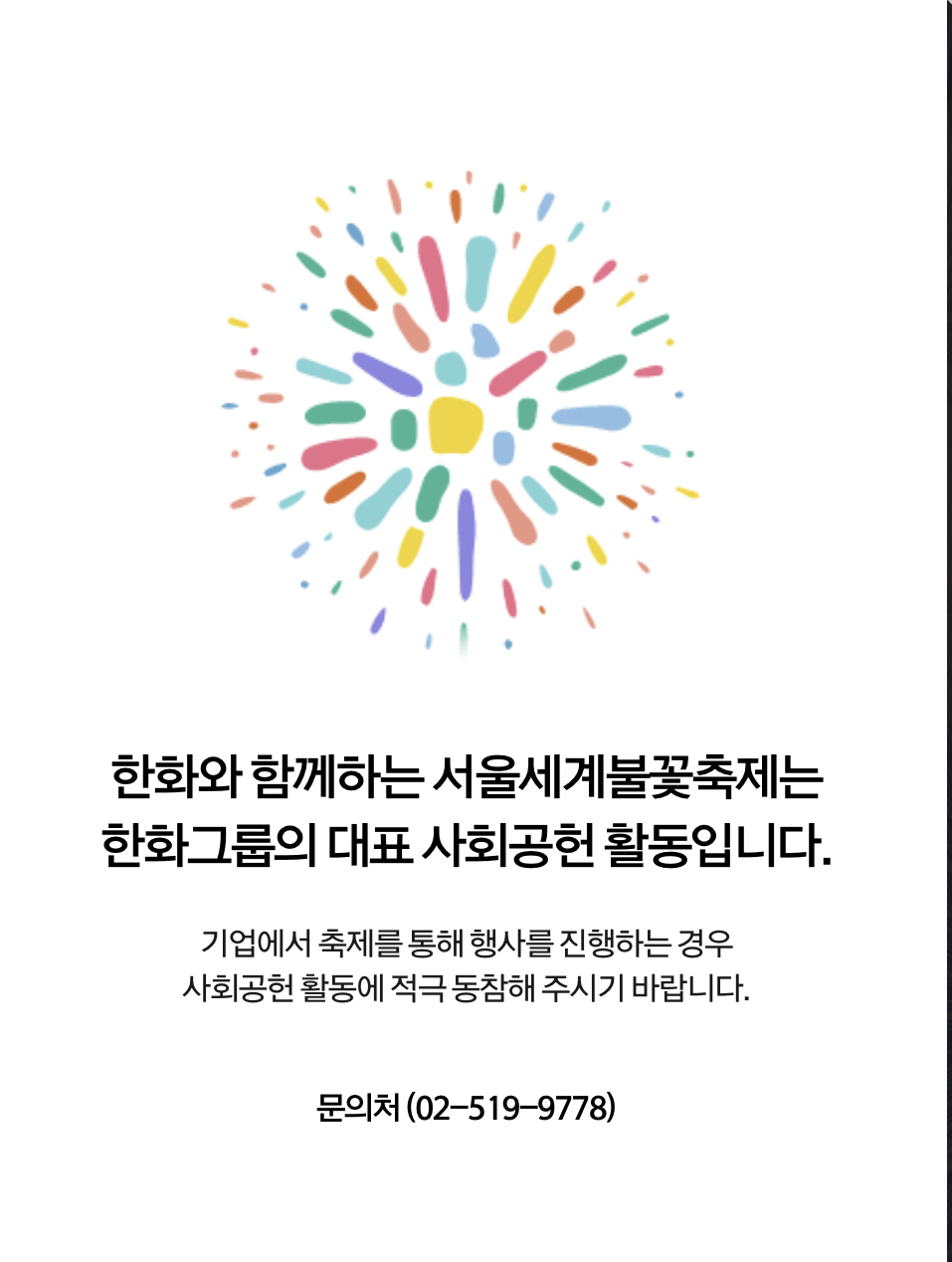 여의도 불꽃축제의 정식 명칭은 서울세계불꽃축제입니다. 하지만 여의도 불꽃축제라는 이름이 조금 친숙하기도 하고 여의도에서 불꽃축제가 개최된다는 그 뜻이 좀 더 명확하기 때문에 저는 이 포스팅에서 여의도 불꽃축제라는 용어를 계속 사용하겠습니다. 여의도 불꽃축제는 한화라는 대기업에서 사회공헌 활동 차원으로 매년 개최하는 것입니다.