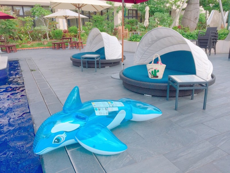 수영장 바로 옆에 비치바가 있어서 룸 번호만 부르고 음료나 술을 주문할 수 있었어요. 남편과 저는 간단히 생과일주스를 주문해서 먹었어요. 한잔에 약 9천 원 - 1만 원 정도 했던 것 같습니다. 저는 쓸데없이 부지런하데도 플라밍고 튜브도 한국에서부터 꾸역꾸역 챙겨갔는데요. 여기에 돌고래 튜브가 있어서 굳이 사용하지 않았어요. 원한다면 수영장 옆에 공기주입기가 있어서