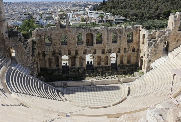 그렇게 아크로폴리스에 도착했어요. 아크로폴리스는 아테네 여행의 하이라이트라고 할 수 있죠. 아크로는 높은 곳이라는 뜻이고 폴라는 도시나 국가를 가리키는 말인데요. 아크로폴리스는 아크로와 폴라의 합성어로 높은 곳의 도시, 국가를 의미한다고 해요. 아크로폴리스는 고대 그리스인들은 지켜주고 마음의 길잡이가 됐던 곳이라고 합니다. 아크로폴리스에서 헤로데스 아티쿠스 음악당을 가 보았는데요. 아크로폴리스 서쪽 정문을 지나 만나는 첫 번째 장소였습니다. 헤로데스 아티쿠스가 죽은 아내를 기리면서 건립하여 아테네 시에 통 크게 기증했다고 해요. 현재까지도 진짜 음악회가 열린다고 하는데 유명가수나 세계 3대 테너 등 내로라하는 음악가들이 이곳에서 공연을 한다고 해요. 시기가 맞았으면 이곳에서 공연을 보는 느낌을 느껴보고 싶었는데 좀 아쉬웠어요.