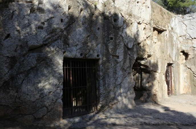 투어 중 가장 첫 번째로 방문한 곳은 소크라테스 감옥이라는 곳이었습니다. 필로파로스 언덕에는 고대 아테네 죄인들을 가두었던 곳이었는데요. 너 자신을 알라 라는 말로 우리에게 익숙한 소크라테스 역시 이곳에 잠시 머물렀다고 해서 이곳을 소크라테스 감옥이라고 부른다고 해요. 소크라테스는 당시 청년들과의 자유로운 대화를 통해 이성과 철학을 실현하고자 했는데요. 하지만 악인으로 내몰렸고 결국 안타깝게도 사형을 당하게 됩니다. 소크라테스가 잠시 이곳에 머물렀지만 그가 이곳에서 죽음을 맞이하였는지는 아직 잘 모른다고 해요. 소크라테스의 죽음과 제자들의 죽음을 그린 그림이 겹쳐서 떠올랐습니다.