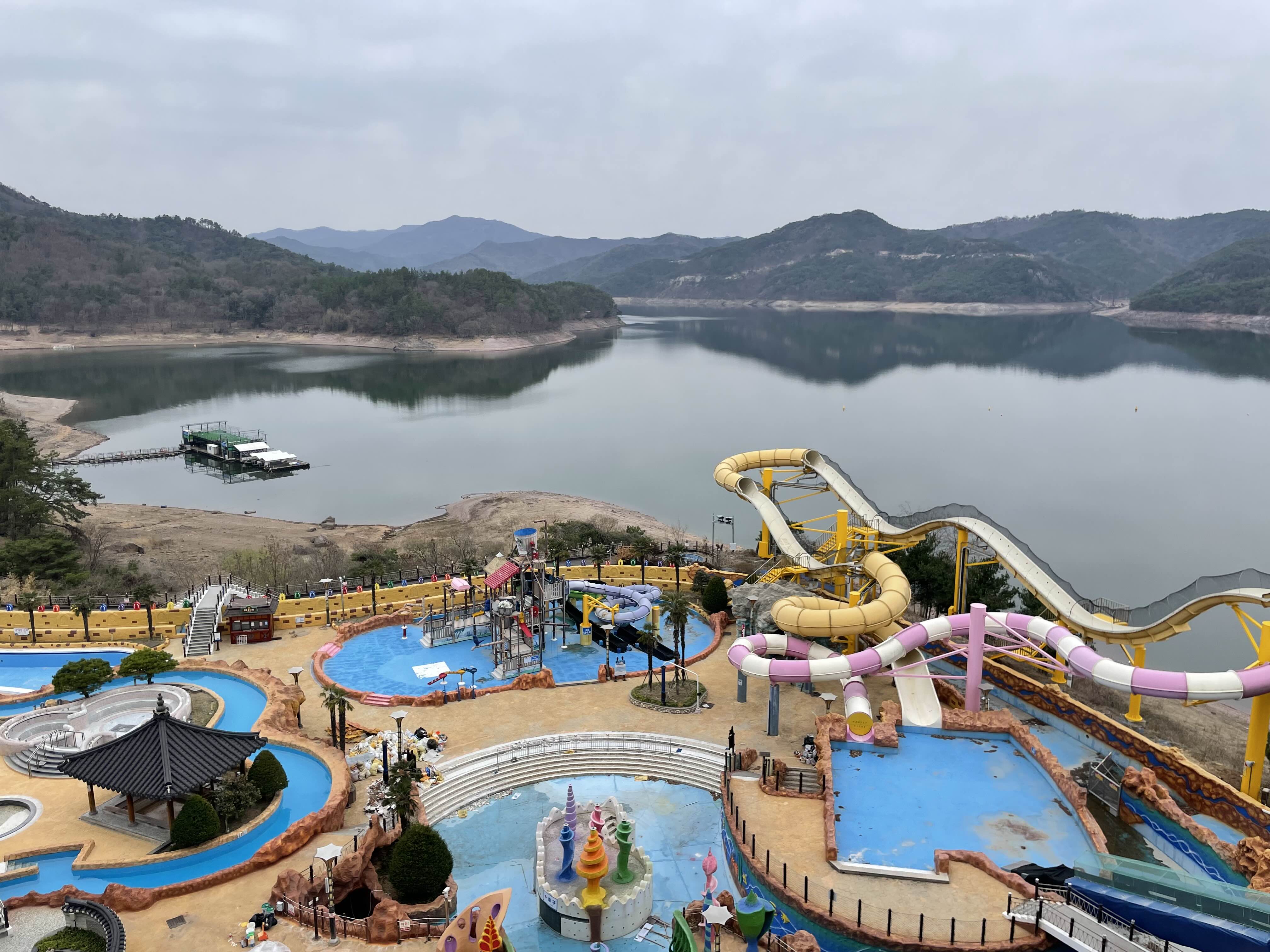 나주호 말고도 이렇게 야외 수영장 워터파크가 보였어요. 저 워터슬라이드 어마무시하죠? 대부분 운영을 하지 않고 있었어요. 이틀밤 이곳에서 머물다 보니 저 개인적으로 느껴지는 장점과 단점이 확실히 있었는데요. 특히 단점은 아까 말한 것처럼 중앙난방시스템인 점, 그리고 칫솔 치약 같은 어메니티가 없었어요. 리조트라고 해서 저는 당연히 칫솔은 챙겨갔지만 치약은 안 챙겨갔거든요. 저와 같은 생각에 많았는지 이모들도 치약을 가져오지 않은 사람이 많았어요. 이 점이 아쉬웠네요.