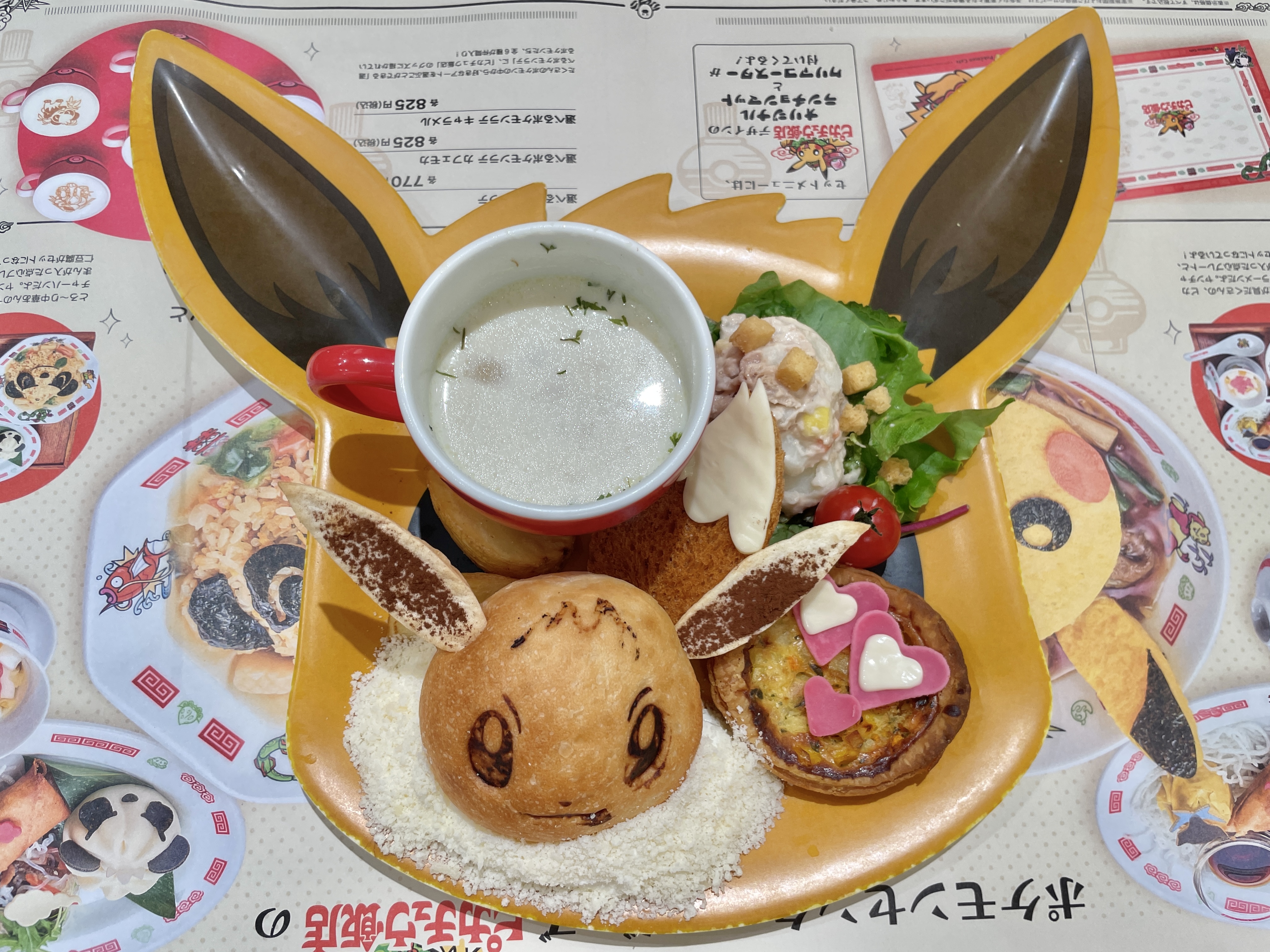 이브이 메뉴도 시켰는데 저는 개인적으로 피카추 메뉴가 더 귀여웠던 것 같아요. 피카추 얼굴은 밥이고 이브이 얼굴은 빵이니까 개인취향에 맞게 고르시면 좋을 거 같아요. 이브이 메뉴에는 양송이 수프가 포함되어 있었어요. 양송이수프가 꽤 맛있었던 걸로 기억합니다.