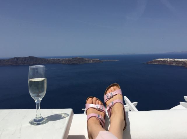 룸마다 별도의 테라스가 있었고 그 곳에 자쿠지가 있었어요. 여기는 1박에 20~30만원대였던 것으로 기억하는데 사실 이아마을 숙소와 크게 다르지 않았어요. 별도의 테라스도 있고 자쿠지도 있고...산토리니 숙소 두 곳 모두에는 웰컴와인이 있었어요. 도착하자마자 한 잔 하면서 에게 해와 칼데라 지형을 안주삼아 허세사진도 찍었어요. 신혼여행인데 페디라도 좀 하고 갈 껄 그랬네요. 원래 네일과 페디를 잘 안 하지만 결혼식 앞두고 네일은 했었거든요.