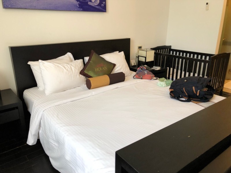 방에 들어서자마자 시원하길 기대했는데 에어컨이 꺼져있어서 더웠어요. 킹베드 하나 있었고 마룻바닥이라서 바닥을 대강 닦고 아이를 내려놓았어요. 예약할 때 아기가 있다고 해서 그런지 베이비 침대가 놓여 있었는데 좀 낡긴 했어요. 근데 어차피 아이는 몸부림이 심해서 여기에 눕힐 생각도 안 했어요.
