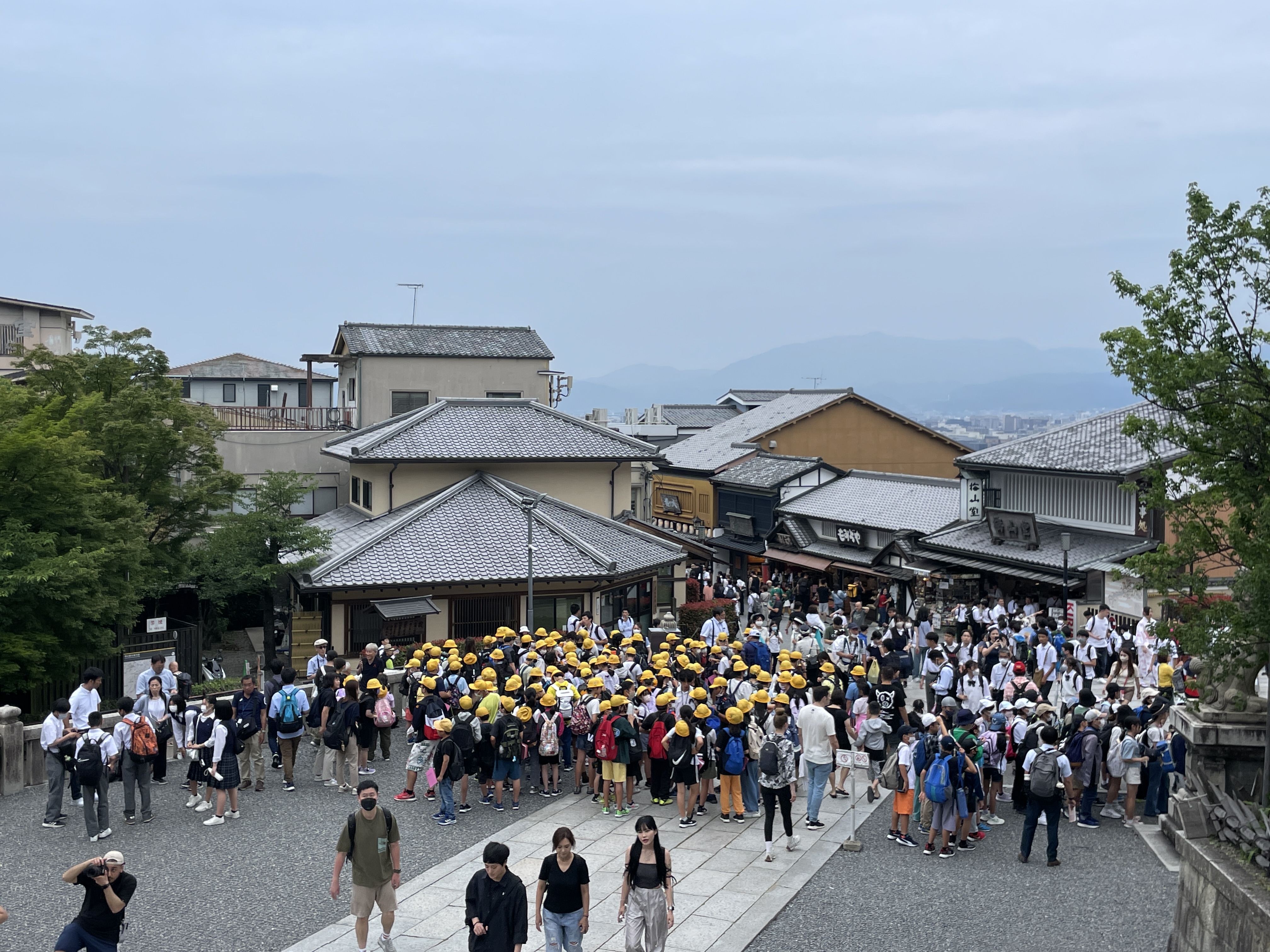 청수사를 찾은 노란 모자를 쓴 병아리 학생들
