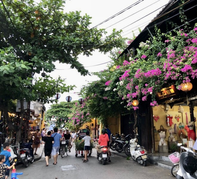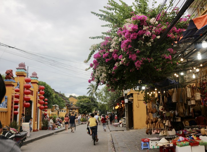 호이안도 루앙프라방처럼 마을 전체가 유네스코 세계문화유산으로 지정되었다고 해요. 건물 위, 원색의 꽃은 그리스 미코노스 생각도 나게 하네요.