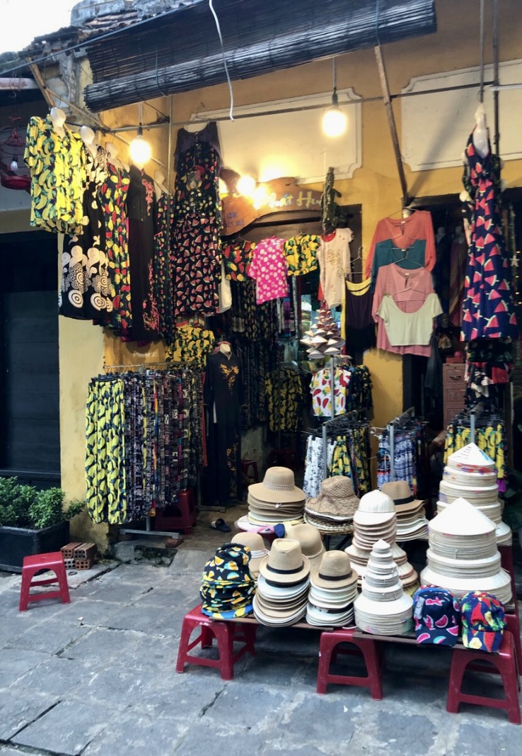 과일이 그려진 화려한 옷을 파는 상점이 곳곳에 있었어요. 시장에서 요런 거 사서 입고 다니는 것도 동남아 여행의 묘미인 거 같아요. 호이안을 돌아다니는 동서양을 불문한 많은 여행객들이 과일옷을 입고 다녔어요. 옷을 많이 안 챙겨가기도 했고 기념 삼아 저희도 사 입고 아이도 사주었어요. 가격도 저렴하고 시원한 소재라서 한국 와서도 종종 입혔는데 엄마가 더 사 오지~! 할 정도로 예쁘고 좋았어요.